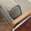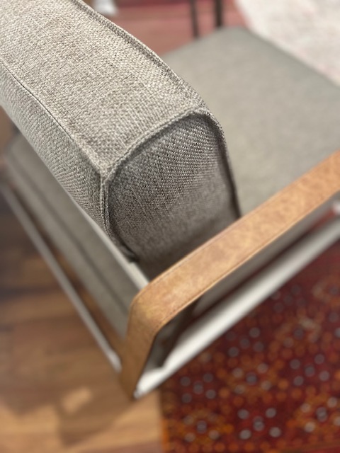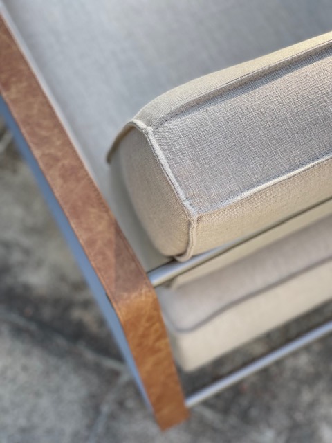 Nuestra butaca es de Indonesia con patas de madera y tapizadas en dos tonos, beige y gris.