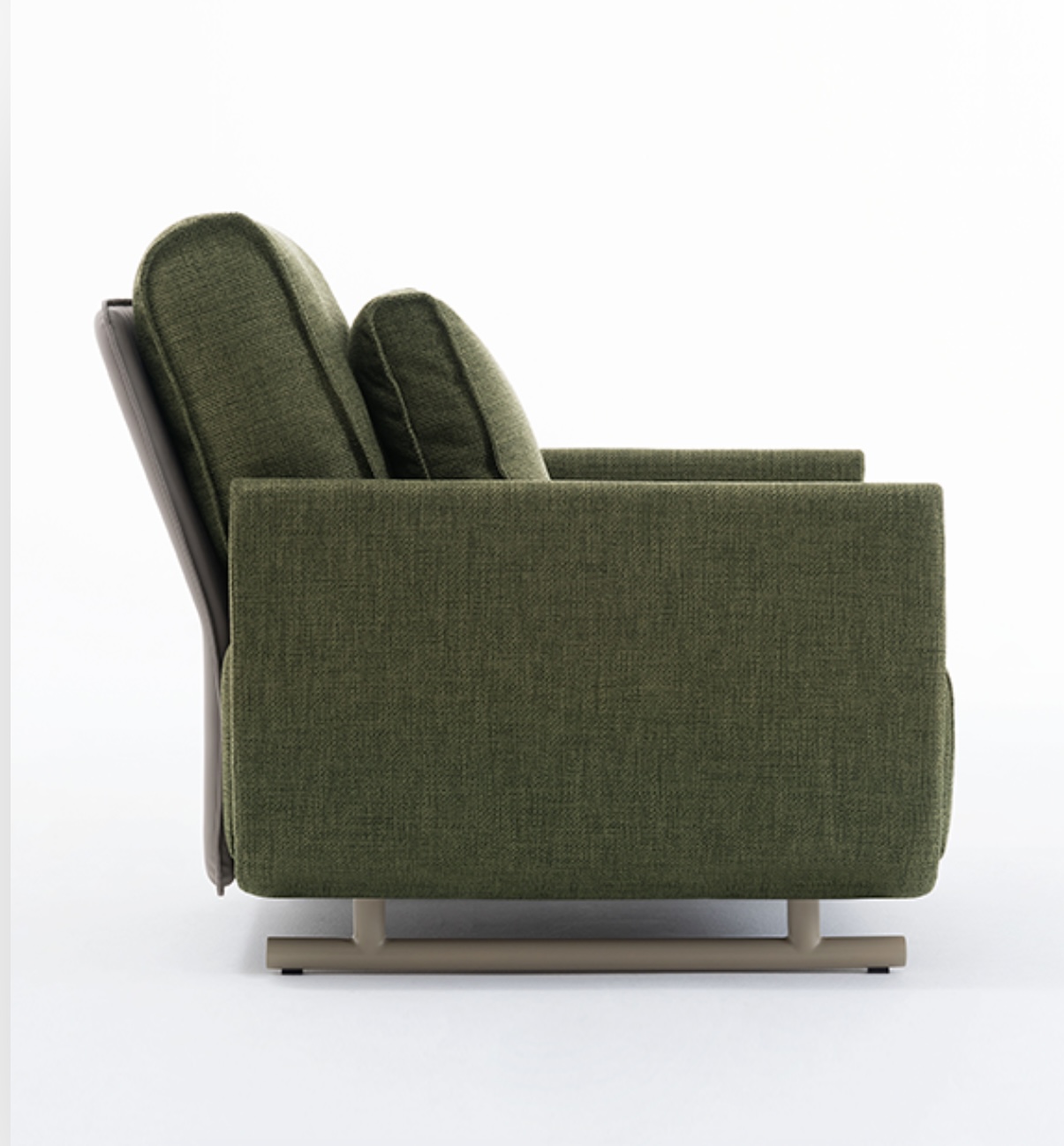 Versión suelta del Versatile Armchair con dos brazos laterales. La apariencia flotante y la combinación de materiales como acero pintado, cuero y tela combinan con cualquier entorno. El asiento voluminoso hace que Versatile sea una buena experiencia de bienestar.