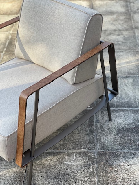 La estructura metálica crea ligereza y al mismo tiempo conecta el respaldo y el asiento, creando así la idea de unión, resistencia y firmeza de la pieza.